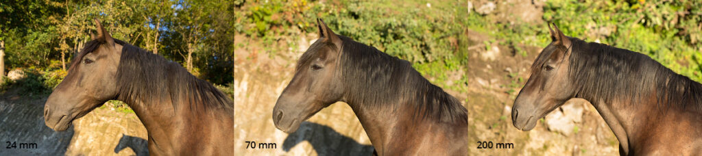 Je kunt met elk objectief paarden fotograferen, echter is de ene lens geschikter als het andere. Maak maar eens een foto van een paard met een groothoeklens, het levert soms hele grappige plaatjes op, maar vaak niet de foto’s die je voor ogen hebt. Het bereik van de lens speelt dus een grote rol. Op de foto’s hieronder kun je goed het verschil zien tussen foto’s van een paard die op verschillende brandpuntsafstanden zijn gemaakt. Op 24mm zie je dat het paard erg uit verhouding wordt getrokken, de neus lijkt veel te groot en de oren zijn juist weer wat aan de kleine kant. Op 70mm is deze vertekening al minder zichtbaar, maar vergelijk het met de foto die op 200mm is gemaakt en je ziet dat het paard op 200mm het allerbest tot zijn recht komt.